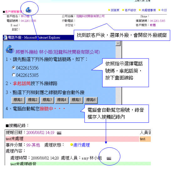 按下第3線接起電話〈或接起電話按下第3線〉電腦馬上叫出該客戶資料及接觸歷史